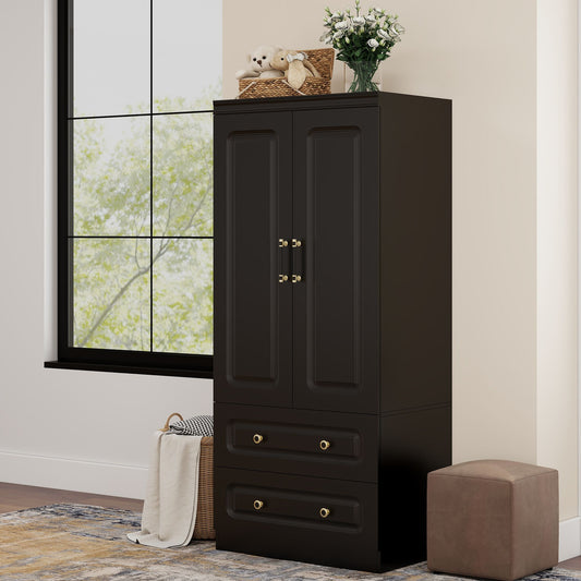 Livelylodge Wardrobe Closet Wooden Armoire Wardrobe – 2 Doors, Hanging Rod, 2 Drawers & Shelves – Tall Closet, Black